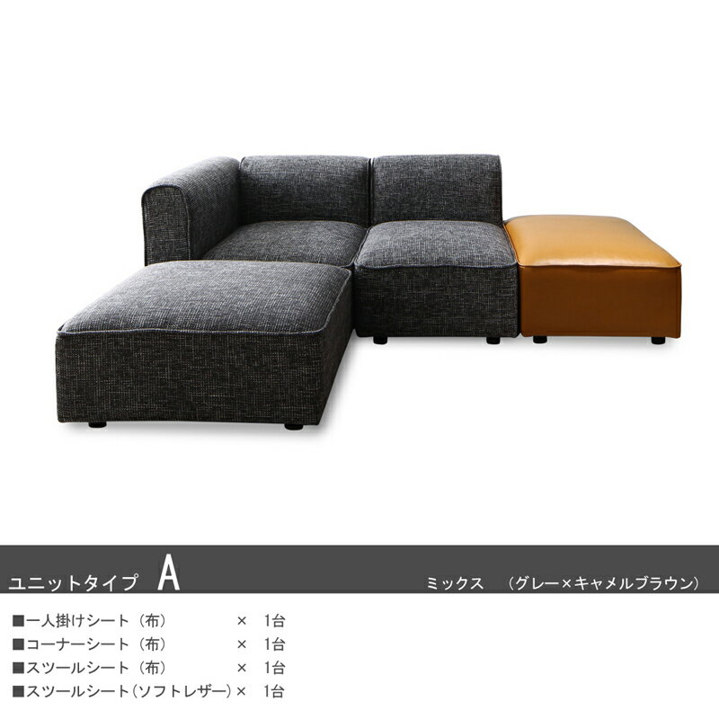 商品名| UN-DユニットタイプAセット コーナーソファカラー| 2色対応主素材| ポリエステル 合成皮革 ウレタンフォームお部屋のスタイルに合わせて変化可能レイアウト自由自在 サイドテーブ付き※1年保証付き モダン 北欧 sofa 4人掛け 3人掛け