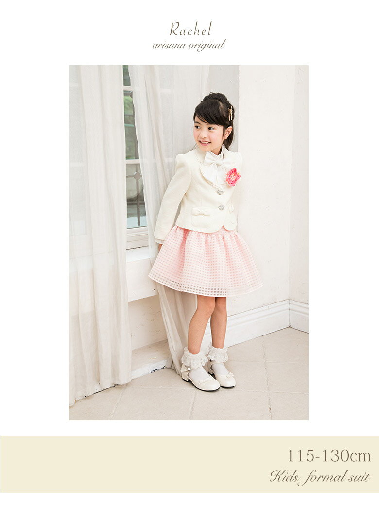 【arisana/オリジナル】 入学式 女の子 スーツ 〜レイチェル〜 ジャケット+リボン付きブラウス+スカート 3点セット/arisana 卒園式、入学式、七五三、結婚式、各種セレモニー、フォーマルシーンに オフホワイトのジャケットにパステルカラーのスカートが 爽やかな、女の子スーツの登場です。
