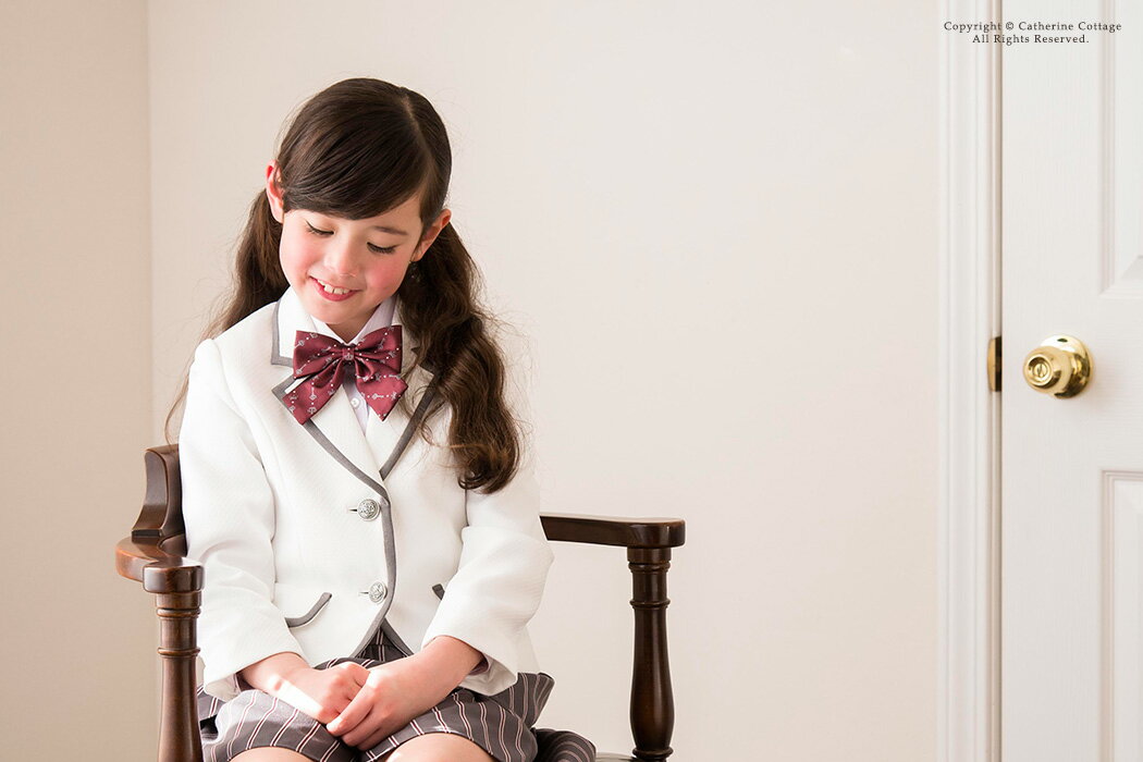 身長130cmのモデルが130サイズを着用 コーディネート品(別売) バックリボンシューズ ジャケット 白ジャケットもすっきりと上品に見えるのは、 Michelle Alfredの素材へのこだわり、丁寧な仕立てのなせる技。